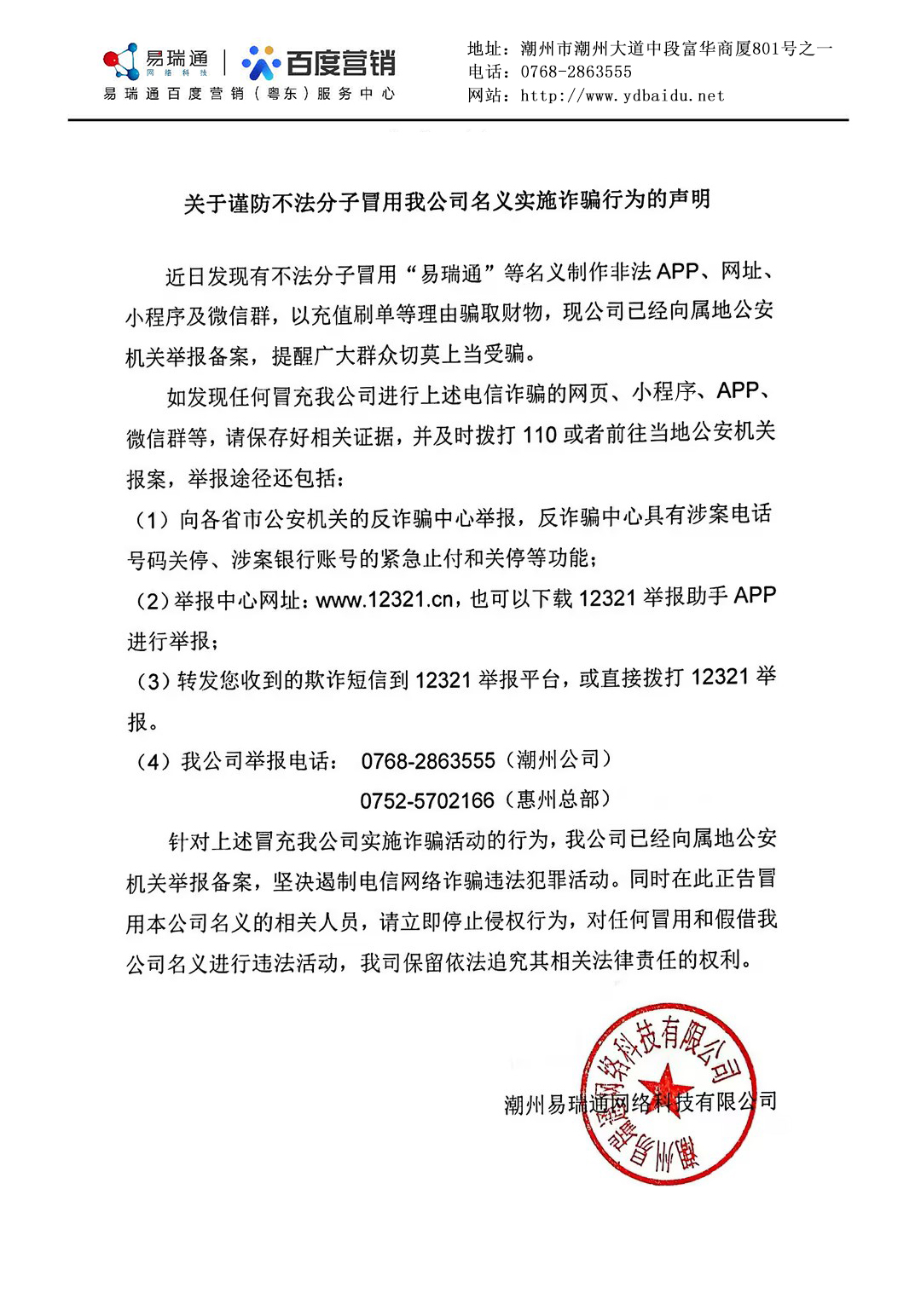 近期,我司發(fā)現(xiàn)社會上有不法個體、人員盜用我司品牌或公司名稱進(jìn)行誤導(dǎo)性宣傳、開發(fā)市場并進(jìn)行非正當(dāng)業(yè)務(wù)往來,該類行為皆屬其個人(或團(tuán)隊)行為,不代表本公司,本公司不承擔(dān)任何法律責(zé)任。并且該行為已經(jīng)嚴(yán)重誤導(dǎo)了消費(fèi)者及我司客戶,嚴(yán)重?fù)p壞我司利益及聲譽(yù)。為避免造成廣大社會朋友的損失,惠州總部、汕頭分部、潮州分部三家公司發(fā)出以下公告:
